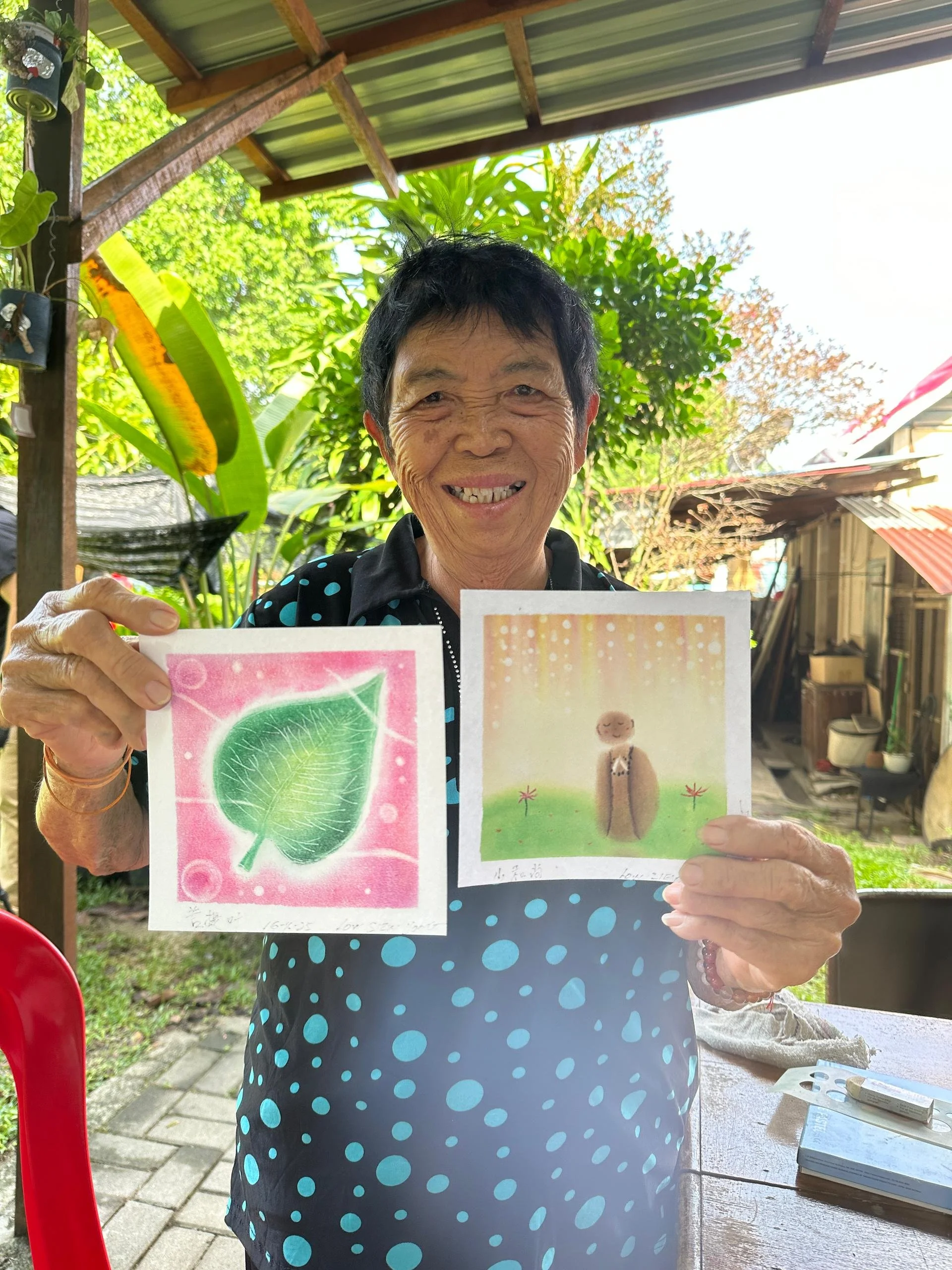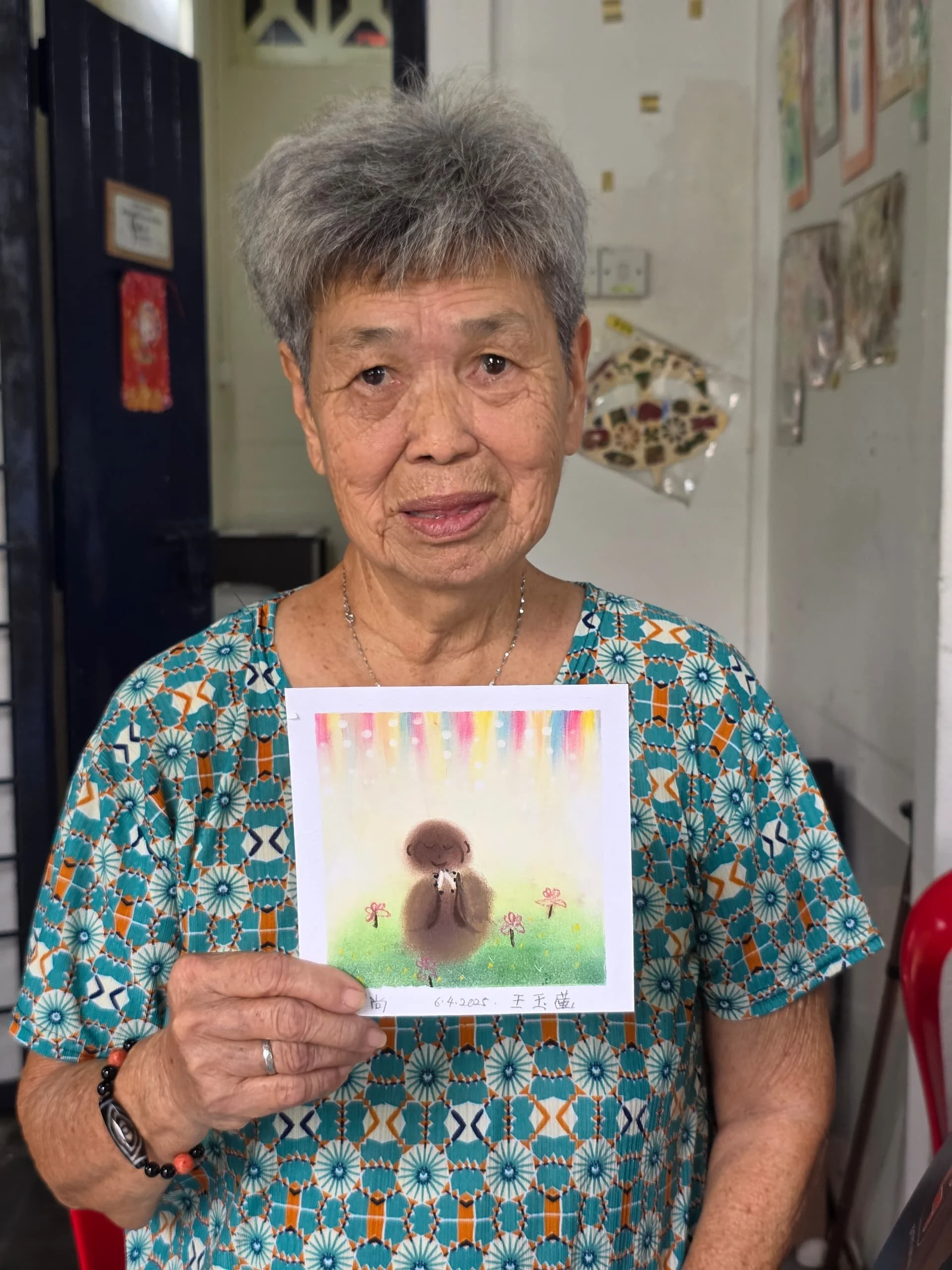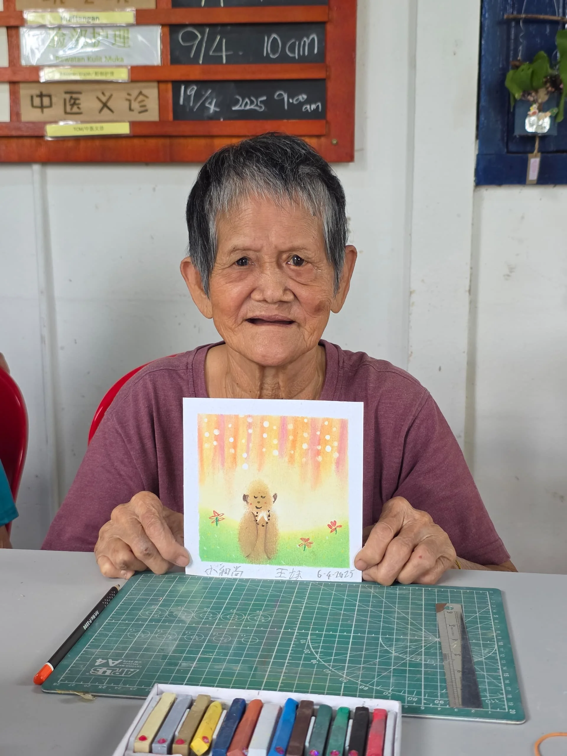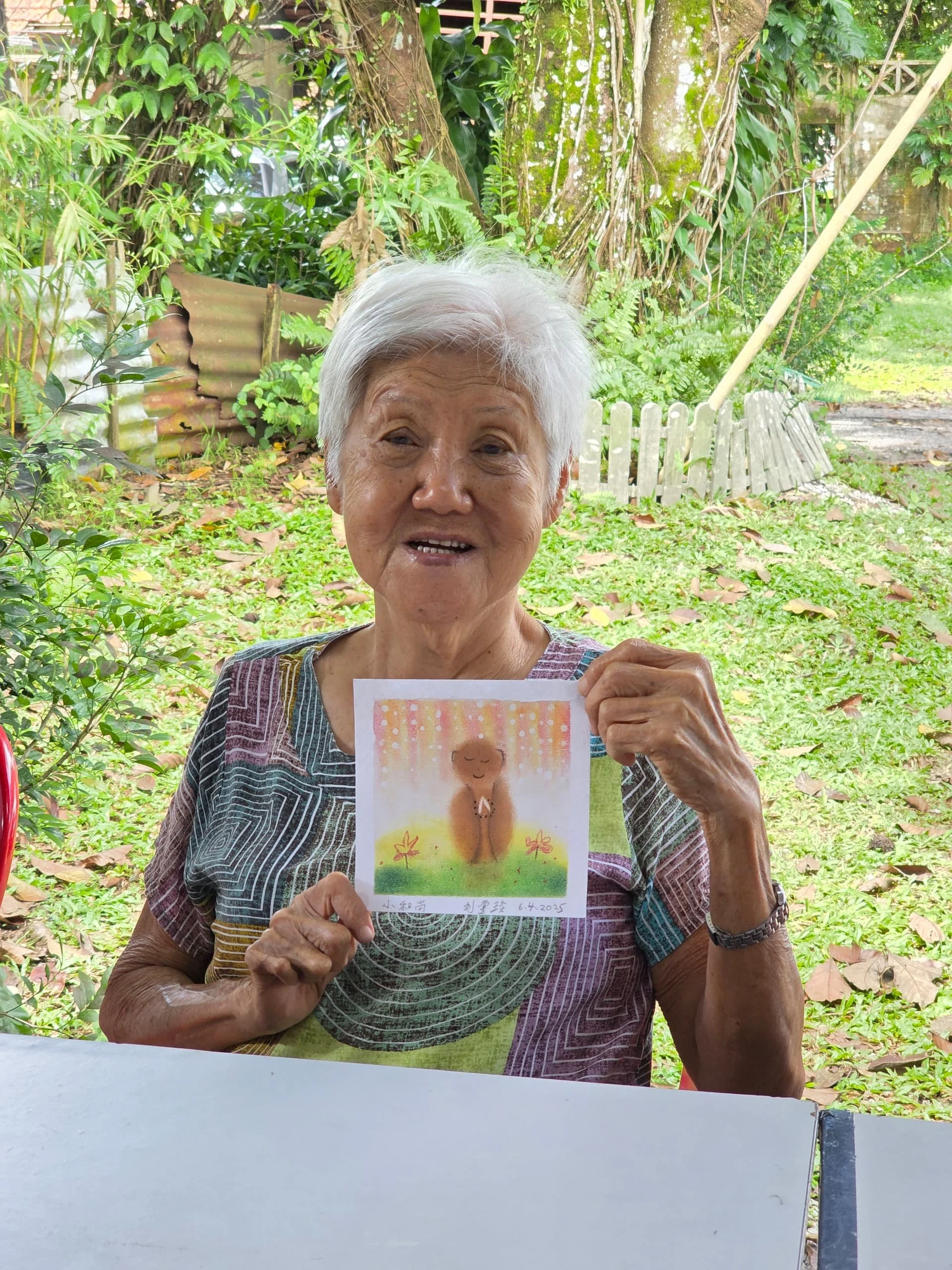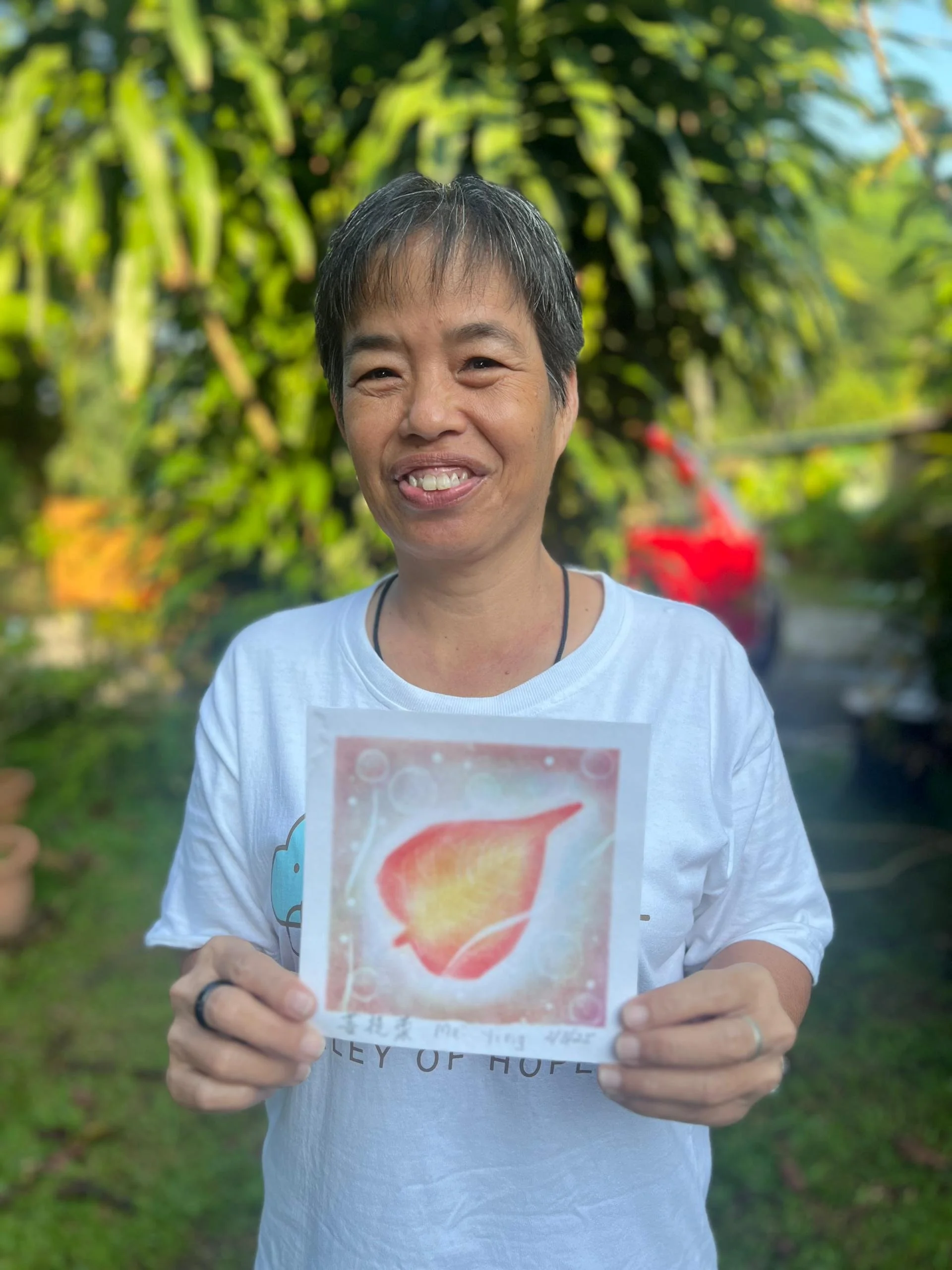 在粉彩导师黄宝杏、郑琳敏及胡慧珍的悉心指导下,老宝贝们用指尖轻柔揉捏出最爱的色彩,创作出一幅幅充满动人韵味与和谐美感的日本粉彩画。第一次描绘菩提叶,第一次绘制小佛像和曼陀罗,老宝贝们的内心被深深触动。每一幅作品都承载着他们对生命的深刻感悟,并折射出他们对宁静与智慧的渴望。
