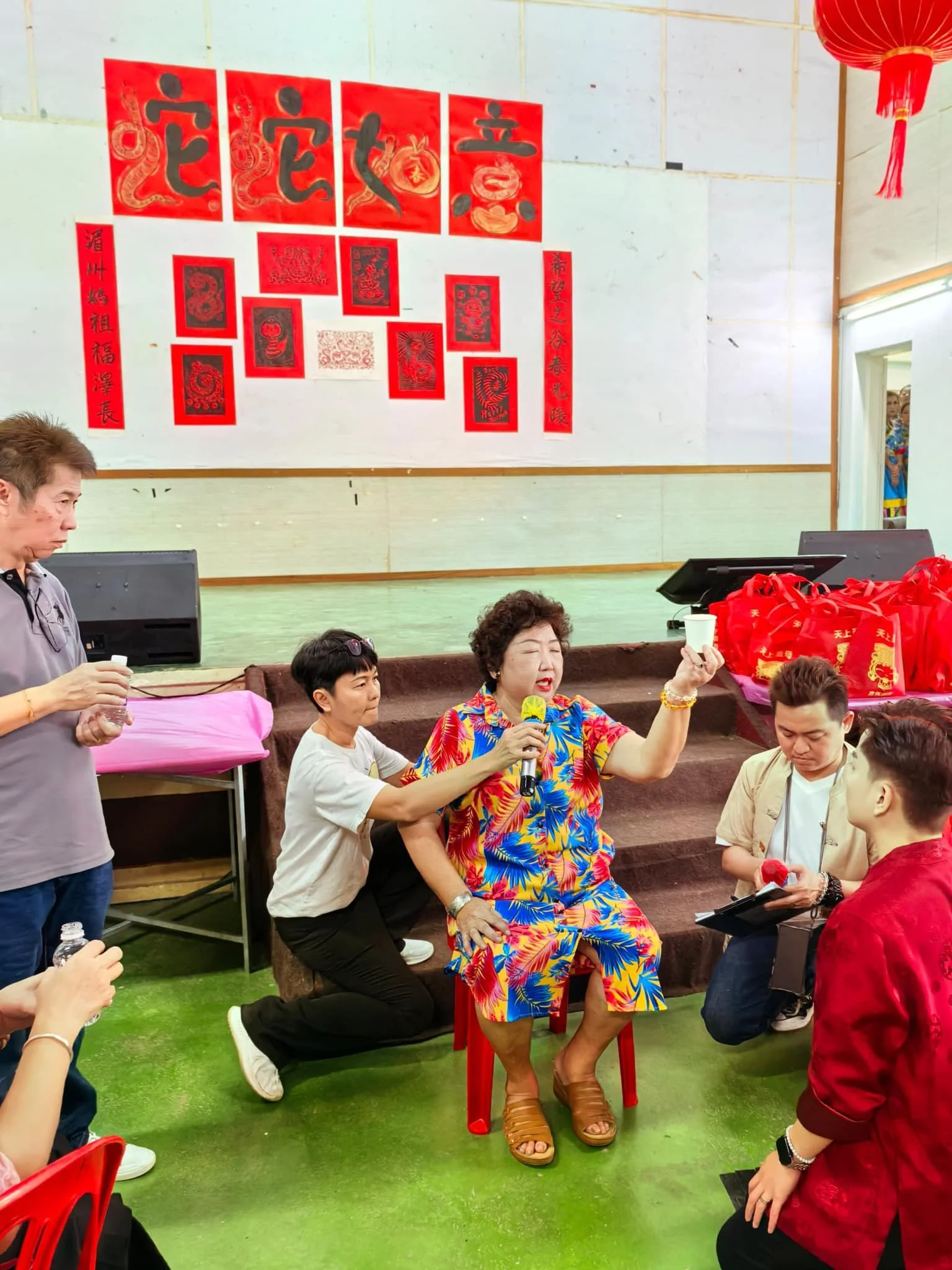 我赶紧蹲在“妈祖”旁边递上麦克风,眼看“妈祖”开心地向大家献上祝福,一番话让全场肃然起敬,气氛瞬间达到高潮。