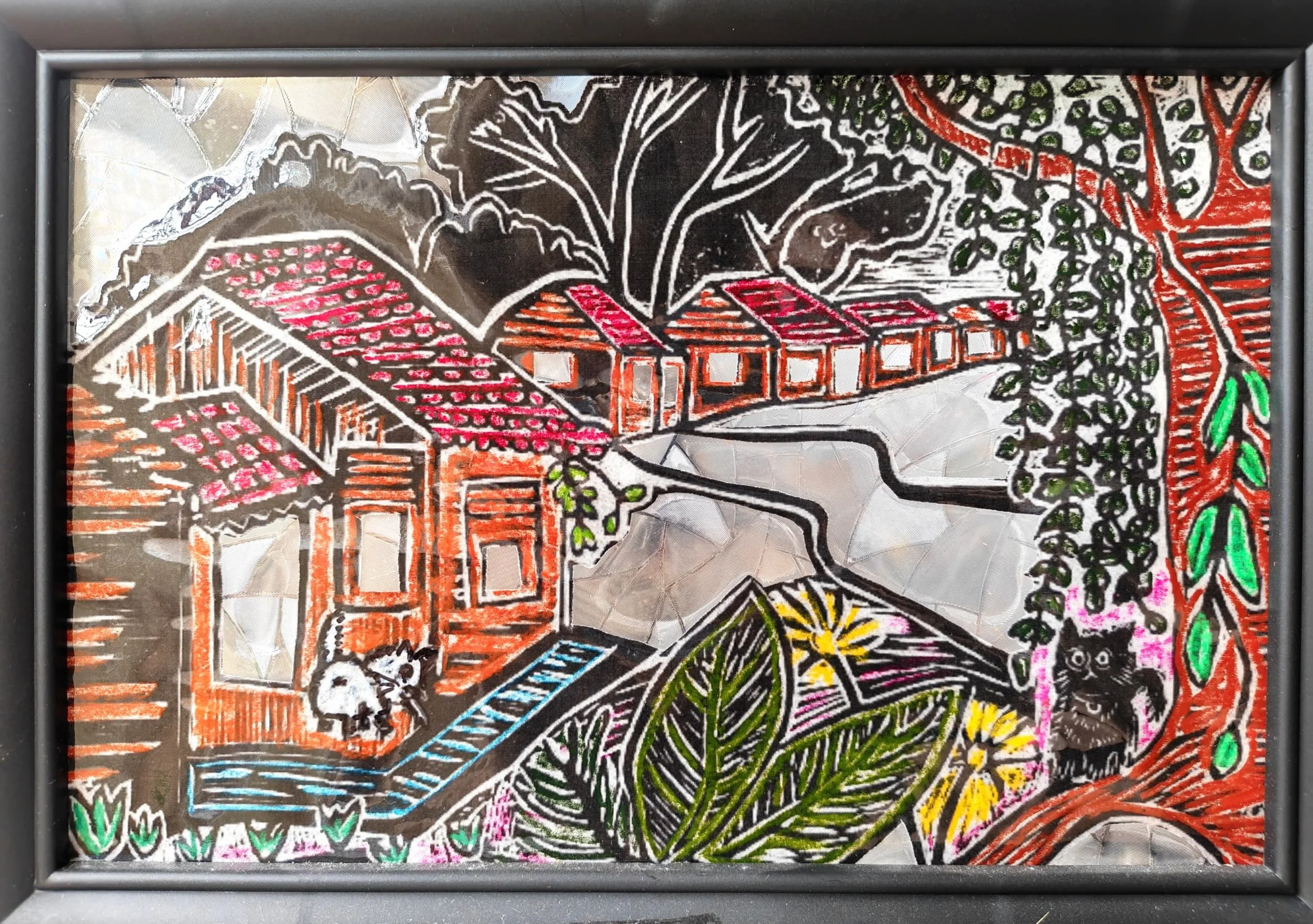 画面的点睛之笔,是两只一白一黑的猫——白猫为阳雕,黑猫为阴雕,明暗对比强烈,却在同一片宁静的社区里悠然自得,让画面多了几分灵动与温度。那时的阿Seong 还未开始画人像,猫便成了她笔下的“主角”。