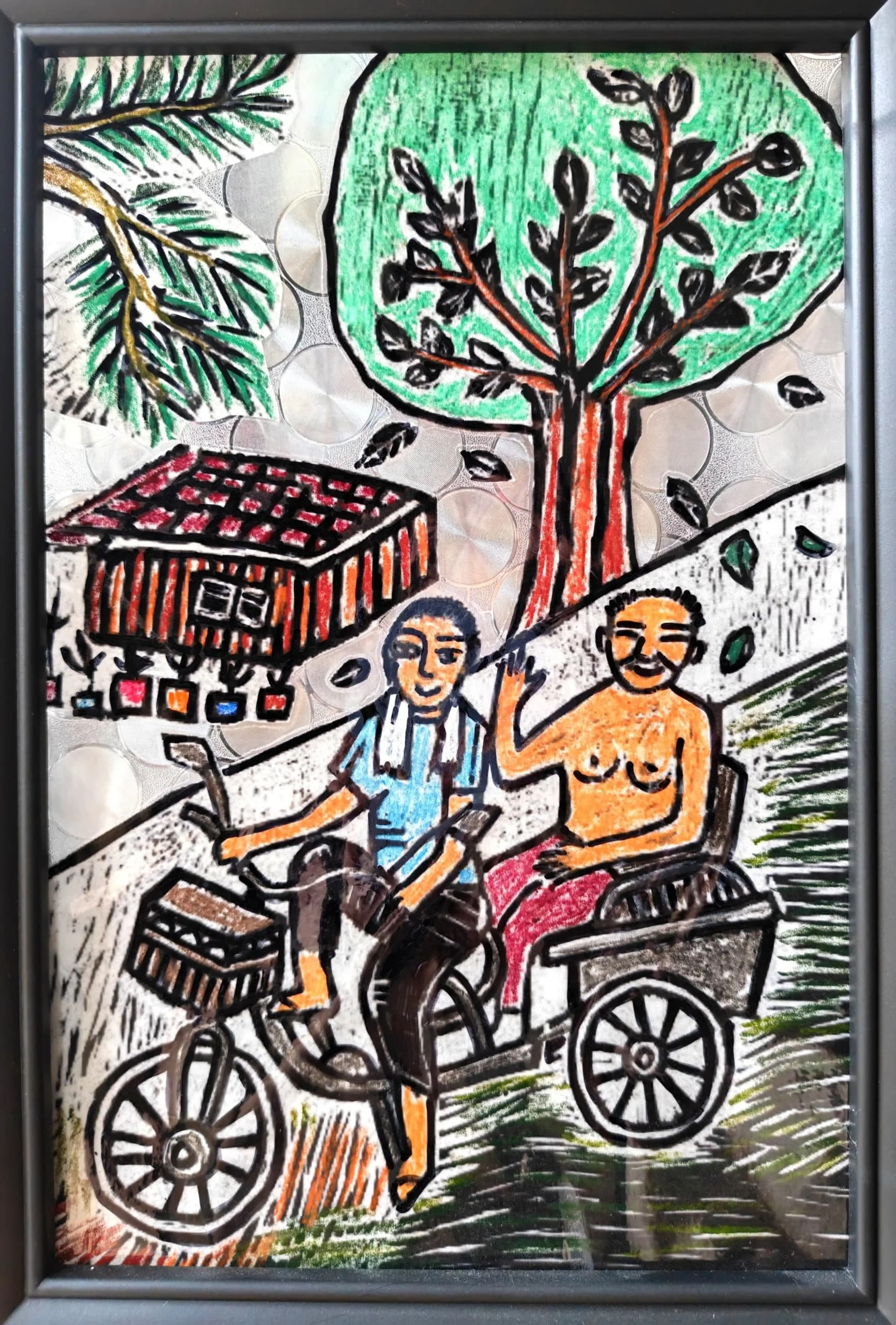 这幅作品出自院民燕珍,灵感来自她与丈夫娘金的生活片段。娘金曾是院内第一位拥有电动三轮车的人,他常骑车到菜房领取物资,再骑回家中。作品取材于一次趣事——当娘金已无法骑车时,故事馆馆长陈彦妮反客为主,披上印有“祝君早安”的毛巾,载着他重温往日的风光,燕珍就拍下了这个场景,也成了她的创作灵感。