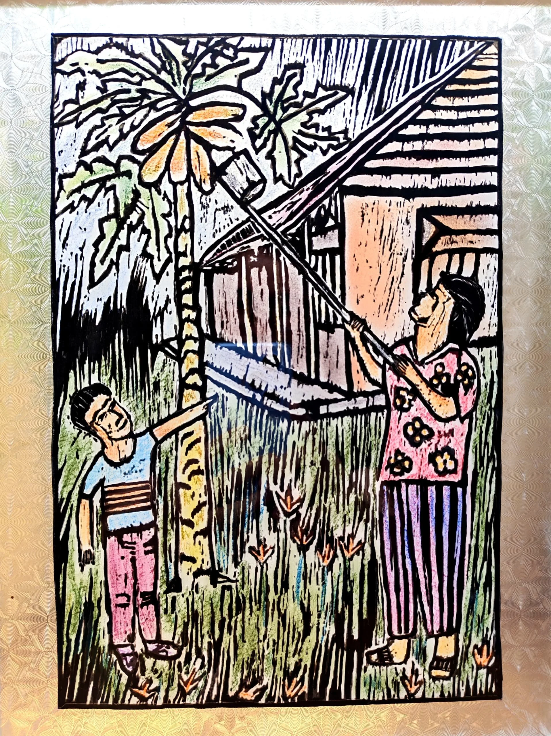 这幅画出自燕珍之手,画中的小屋是JKR 311——她先生杨娘金的家。屋前种着四、五棵木瓜树,枝叶婆娑,果实累累。