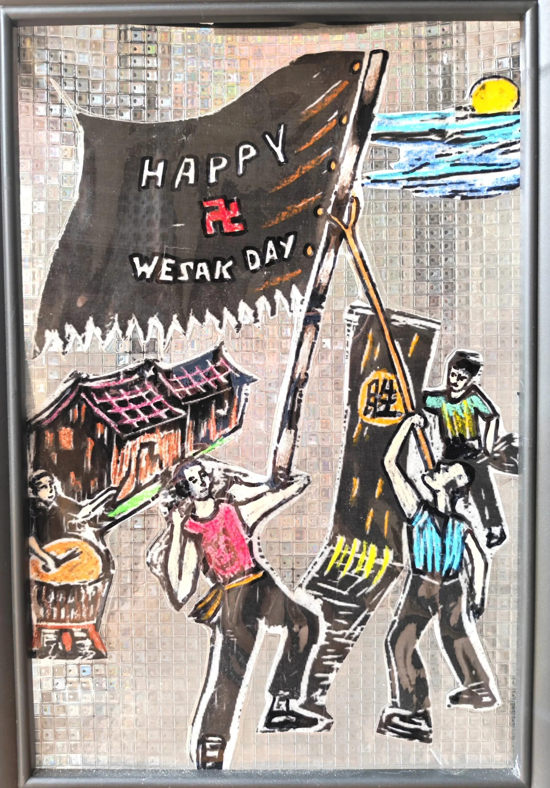 这幅作品是Robin 梁志君(阿Leon)于2023年创作的。令人惊讶的是,他并非依照照片,而是凭记忆与想象雕刻完成。画面再现了 1969 年后,从槟城木寇山搬迁至希望之谷的 319 位病人带来的“撑大旗”文化(Chingay)——一种将巨旗高抛、用下巴、肩膀、手肘等部位接旗,并舞动巨旗的独特表演。阿Leon初到此地时,曾被这种热闹如杂技的场景深深震撼,于是将旗手与锣鼓手的神态刻画得细致入微。