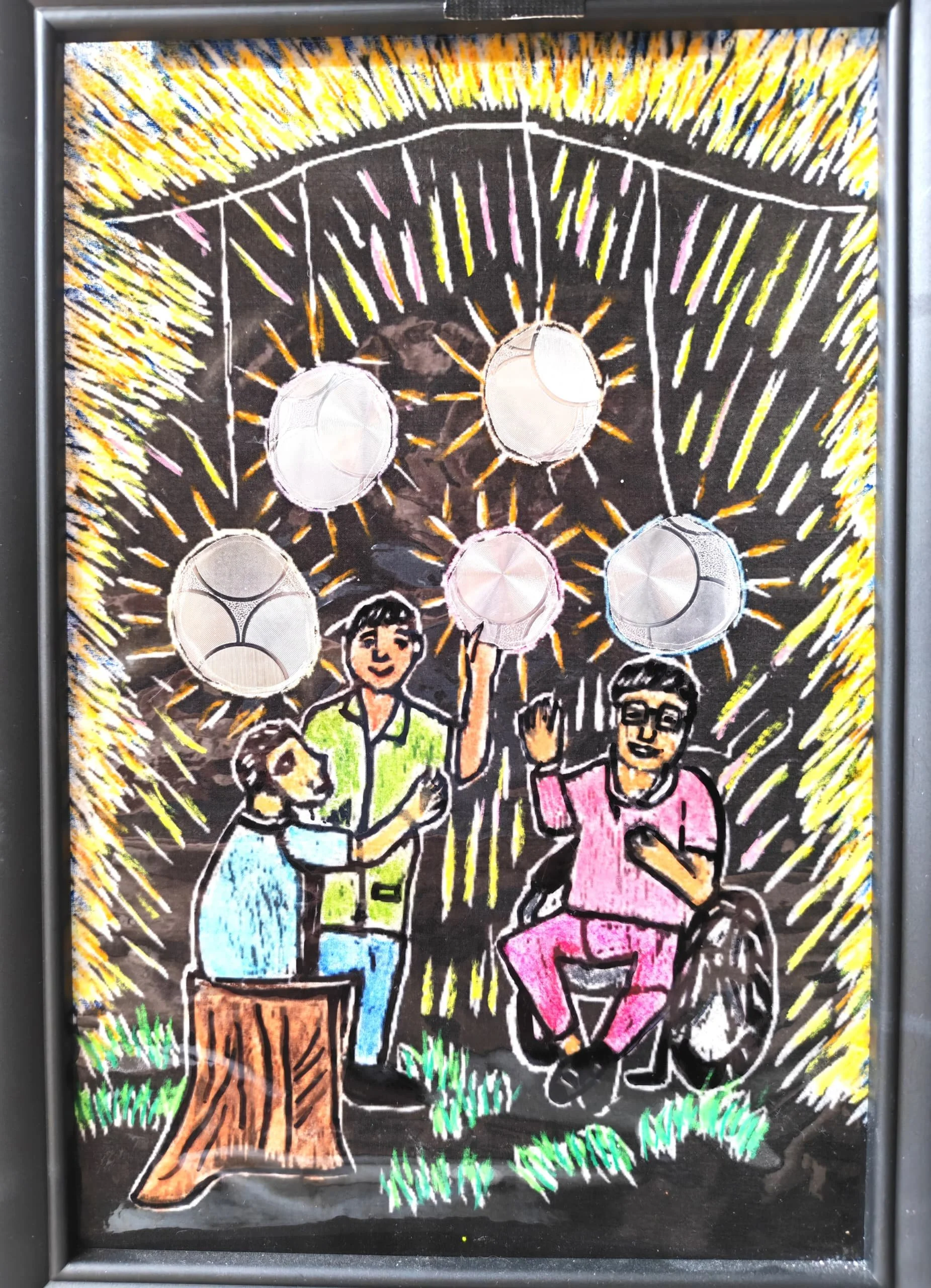 这是2022年中秋节展出的作品,是陈清源在当年灯笼制作活动中完成的。画中的是她坐在轮椅上,凝望着自己亲手制作、正发着光的灯笼。