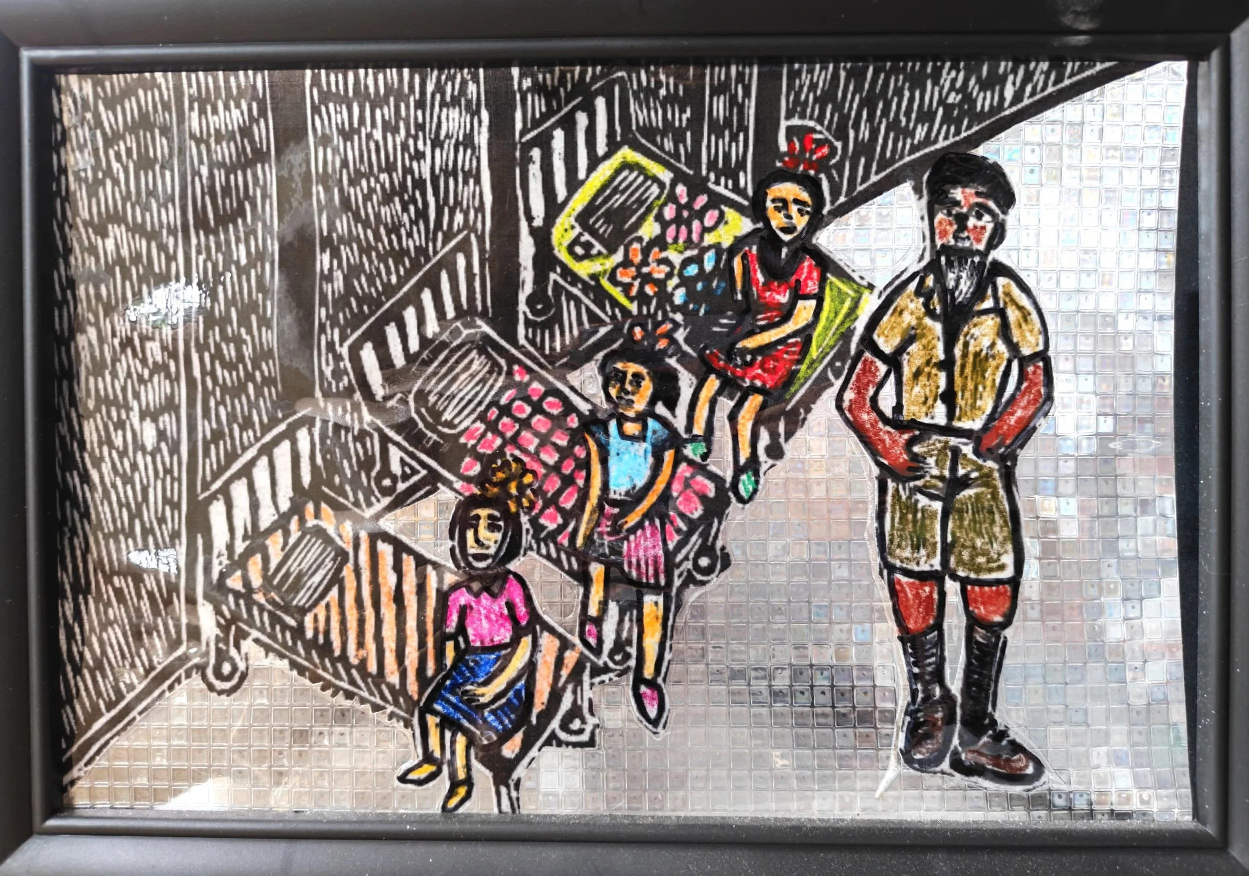 这一幅画是陈清源的作品,灵感来自她童年在“细佬哥楼”(儿童楼)的温暖回忆。那时的第二任医药总监慕斯尔文医生 (Dr. B.D Molesworth),人称“胡须佬”,总是穿着短裤、高袜,留着一把长长的胡须。他希望孩子们都开开心心的,不要愁眉苦脸。每次巡楼前,护士们都会忙着采来鲜艳的大红花,为孩子们别在头上,还让她们穿上漂亮的碎花裙,整齐地坐在床边等待医生到来。孩子们一见到他,都会喊着:“胡须佬来了!”如今85岁的陈清源依然记得那段日子,医生让他们感到自己很美丽,这带给了她们欢乐。她将这份珍贵的记忆,雕刻成了这幅作品。