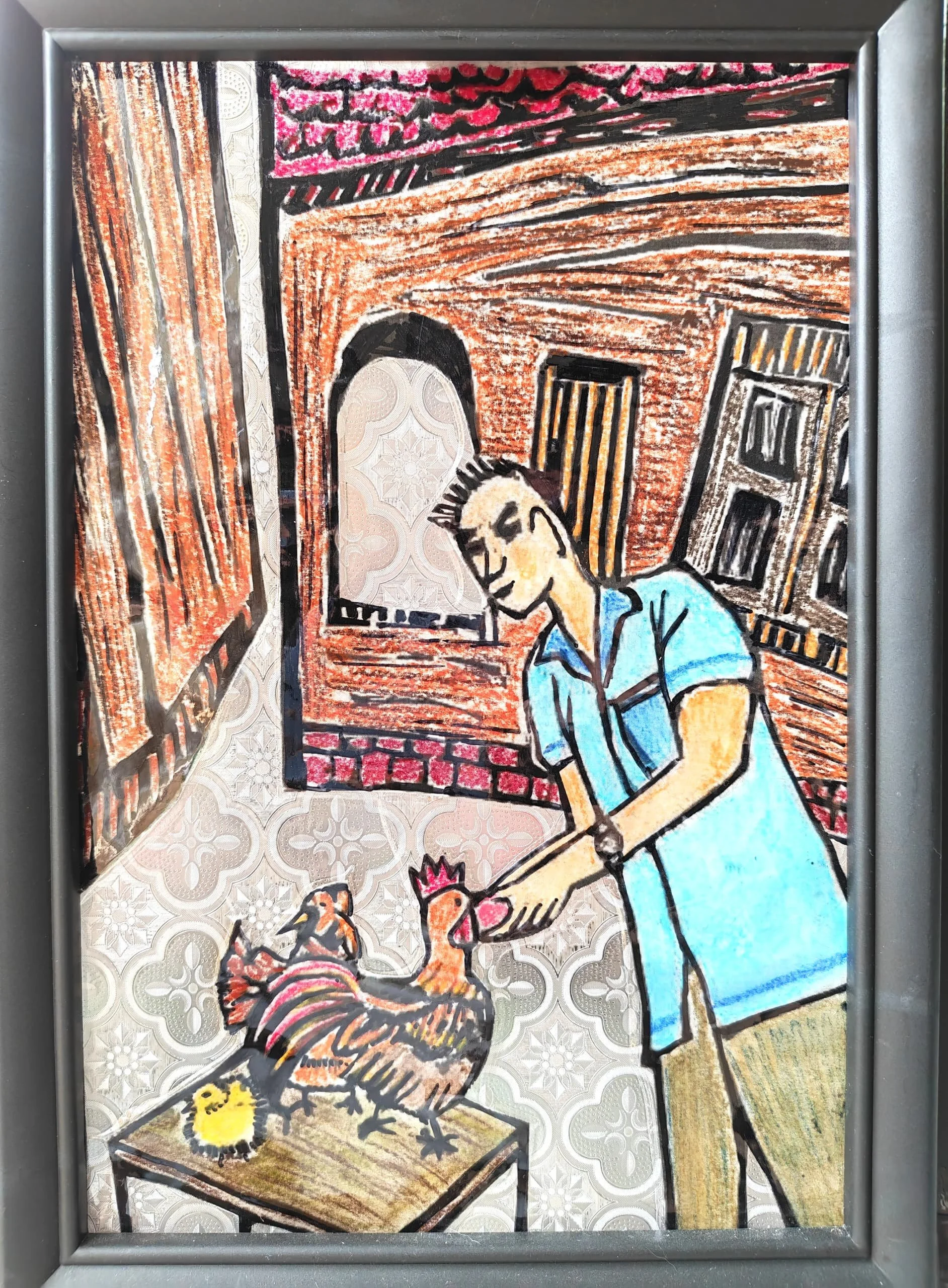 这幅作品出自“逃学威龙”陈永昌之手。画中,他雕刻了自己在大路旁屋仔里的住处——一栋旧式的Bungalow。过去,这里是英国高官的住所,而他能住进来,是因为当年担任东院的Section Steward,也就是巴刹的总管。虽然Bungalow外表简陋,没有多余的装修,但屋子的结构优雅,透着古迹特有的韵味。走到后院,是他的小天地——三只公鸡悠闲地踱步,那是他当宠物养的,不是为了吃肉,永昌养它们就是图个陪伴。除了鸡,他还养着四五只狗,每天忙着炒“狗饭”,给它们煮好一大锅热腾腾的餐点。