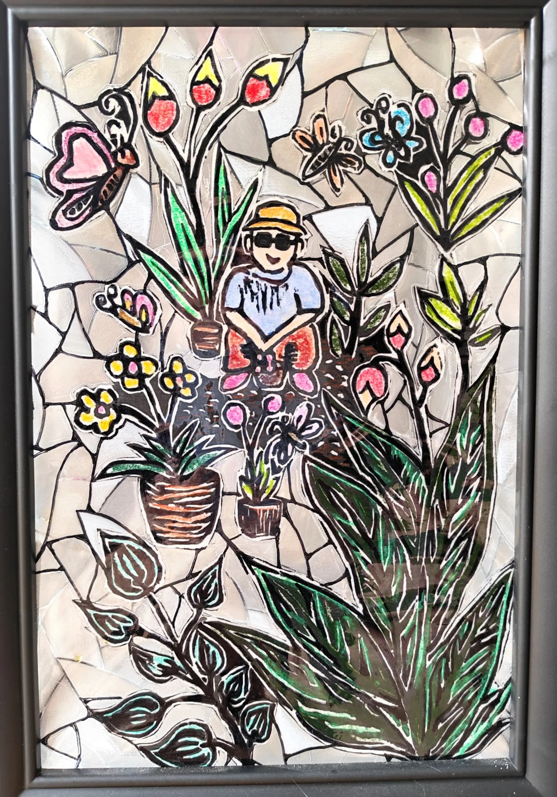 Siam仔在自家小屋前种花、卖花,比起做生意赚钱,她更多是为了打发时间,遇到导览团还常免费送花。她性格直爽,说话升量很大,但心地善良,常骑摩托为贫困老人买饭。近期,她因家门前的路不平,而跌伤脚踝。在家休养的日子里,她仍坚持创作,雕刻出莲花。她说,若之后身体康复了,要继续帮助更多人。这幅作品刻画了她院内种花的日常,朴实又充满温情。