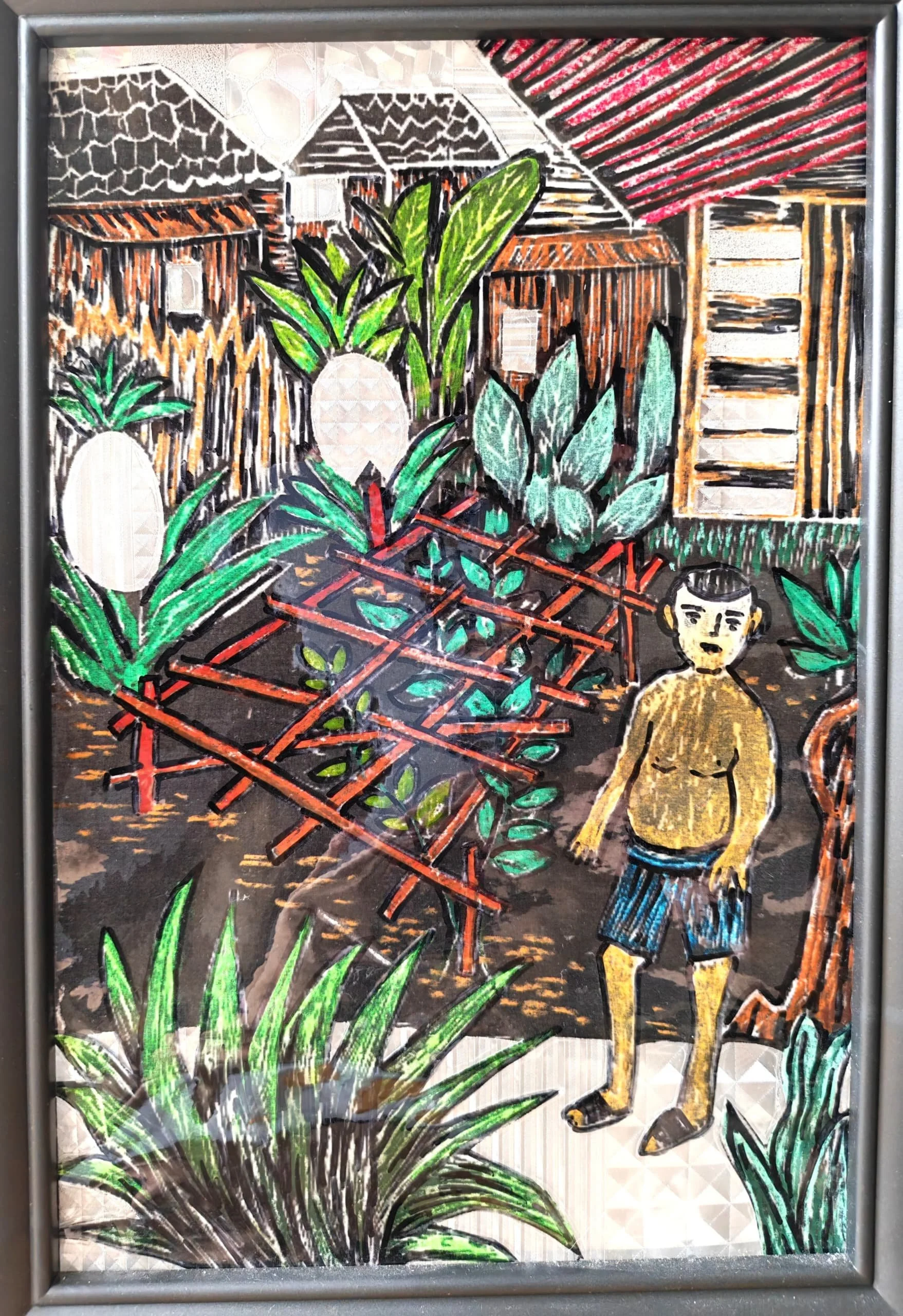 这幅画出自阿康(杨晋康)之手。画中,他赤着上身,只穿一条短裤,正埋头在菜园里劳作——那是他的真实写照。阿康生活极为节俭。因没有政府的补助金,他的生活开销主要依靠客家公会每月三百元的资助,如今又多了马来西亚麻疯病救济会(MaLRA)的三百元补贴。即便如此,日子依旧拮据。加上骨骼有问题,行走不便,每个月还得买Glucosamine等维他命,药费不低,因此他更加省吃俭用。
